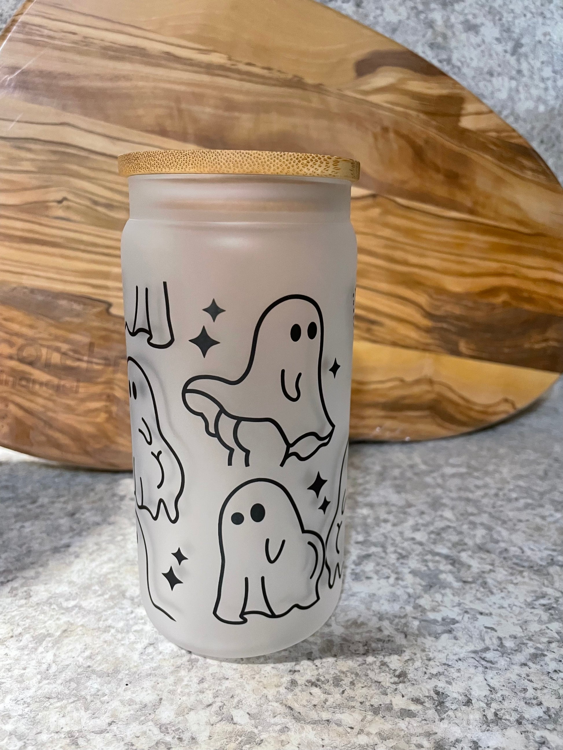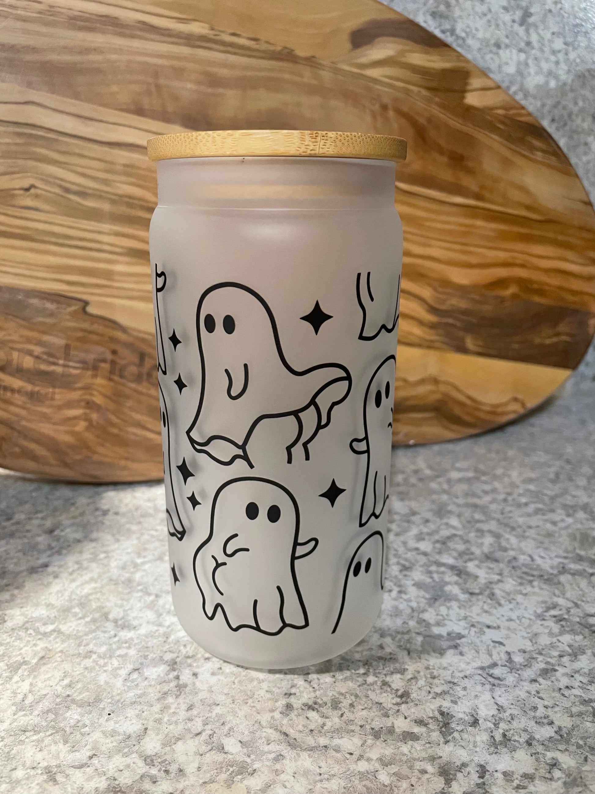 16oz sublimated frosted glass cup with bamboo lid and glass straw.