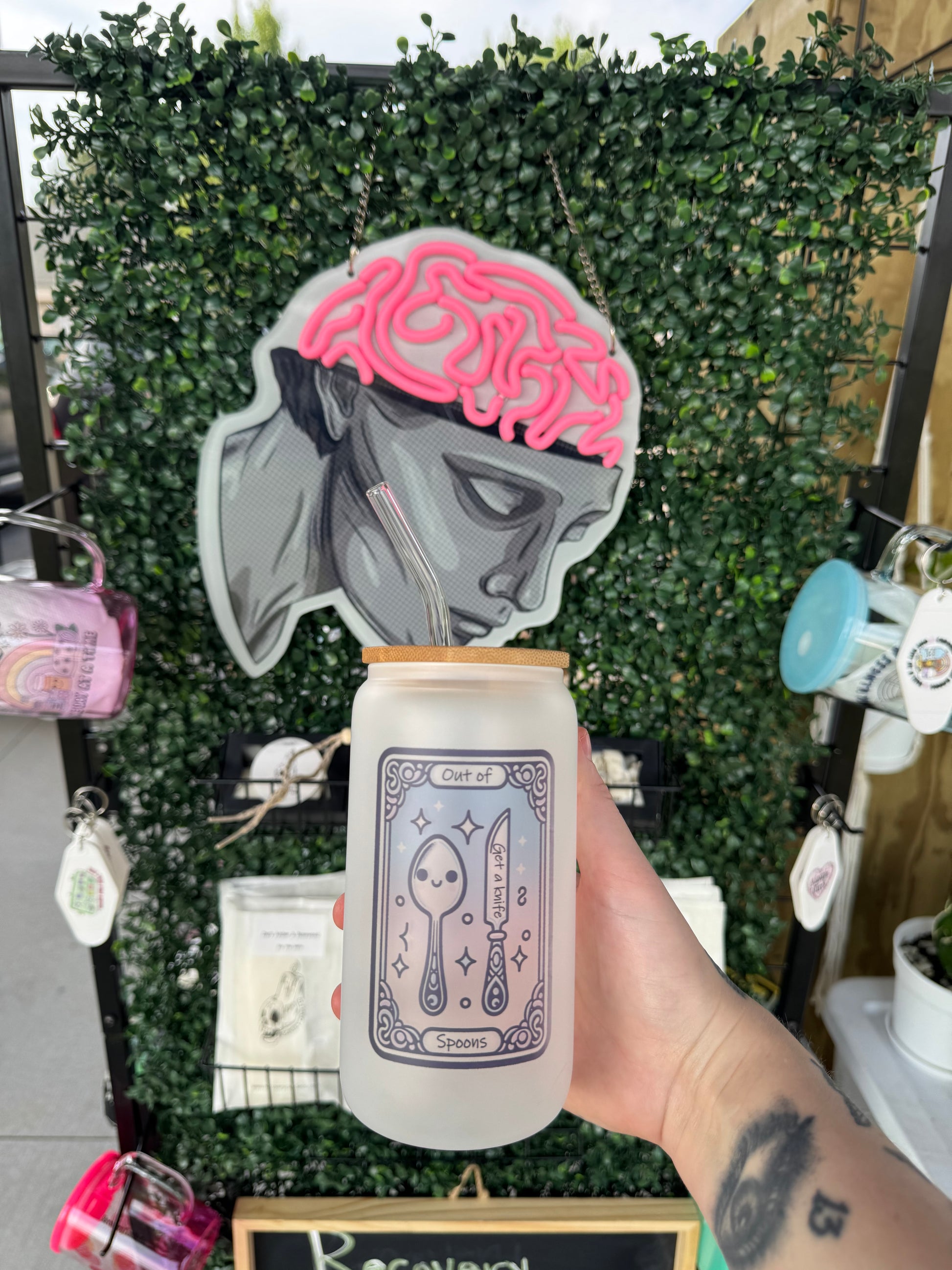 16oz sublimated frosted glass cup with bamboo lid and straw.