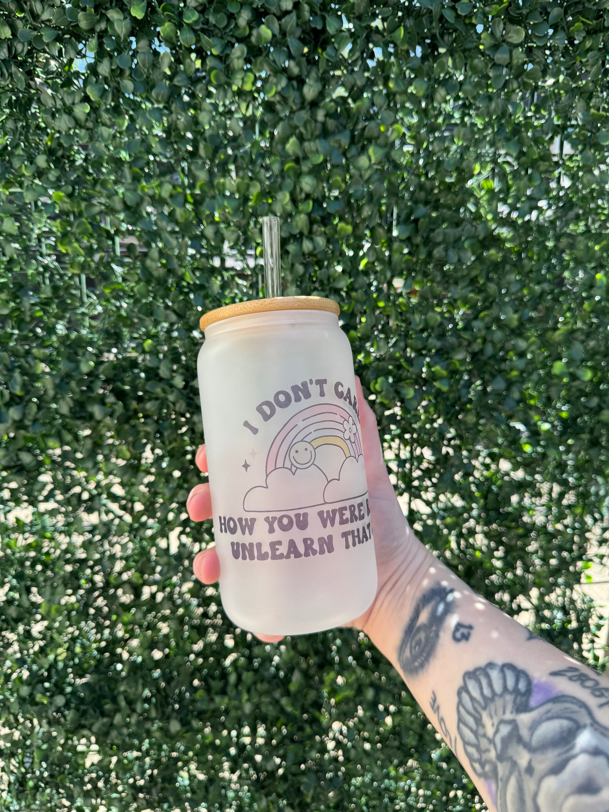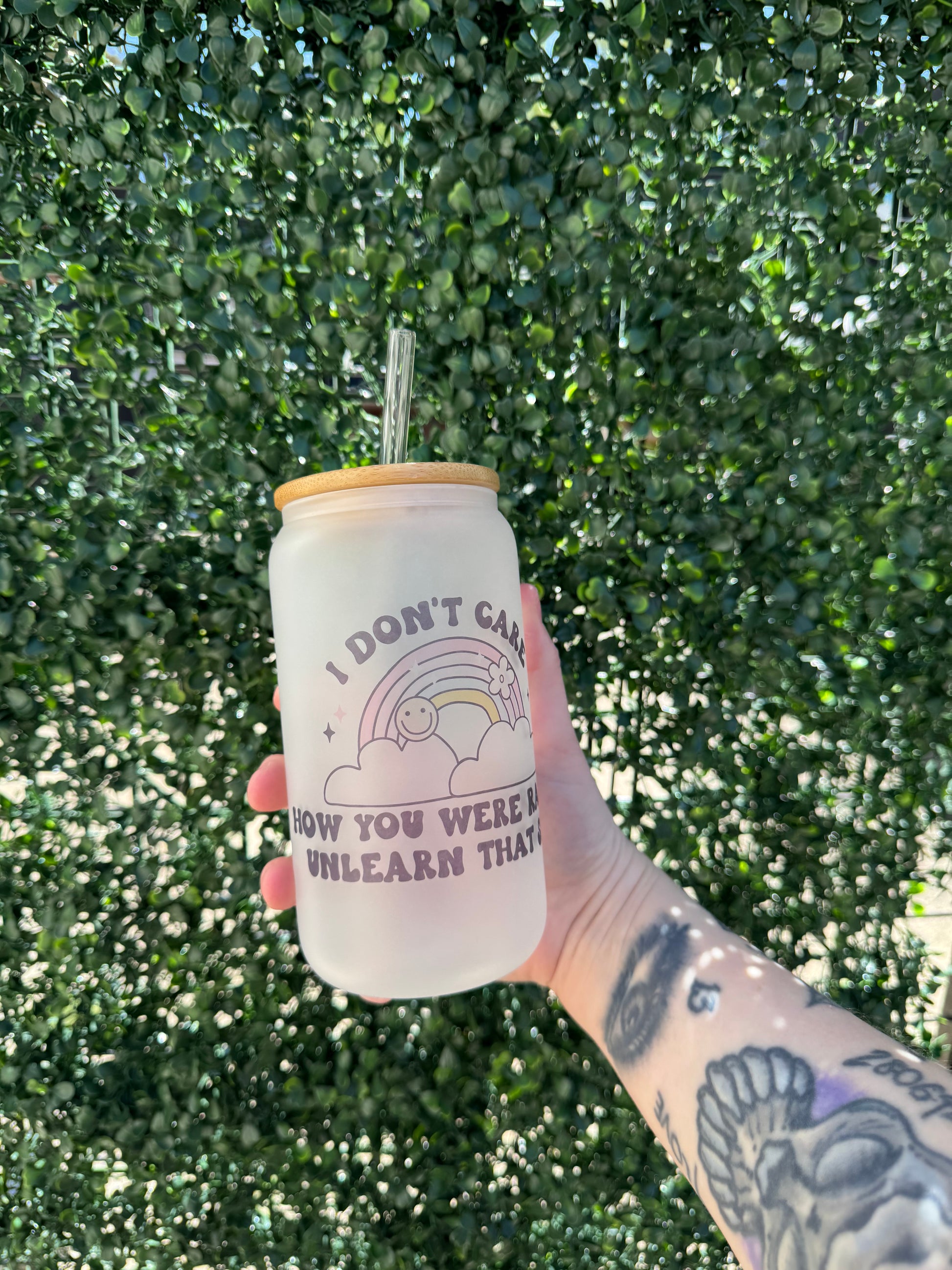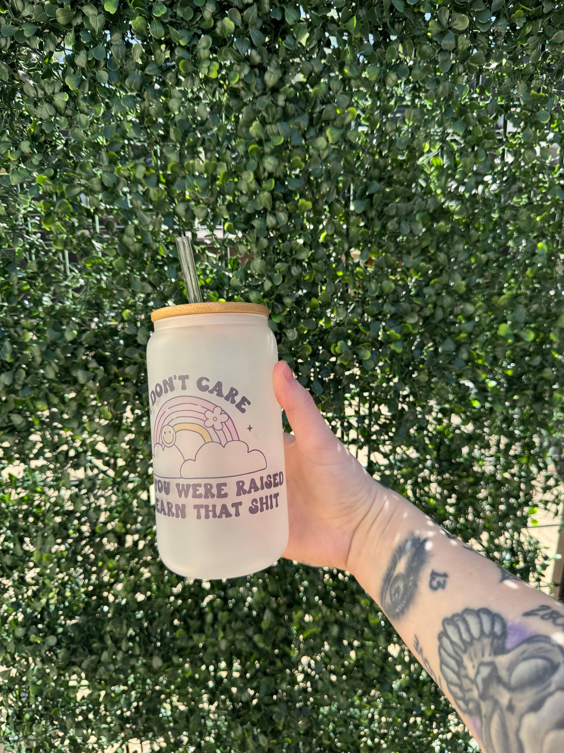 16oz sublimated frosted glass cup with bamboo lid and straw.