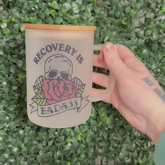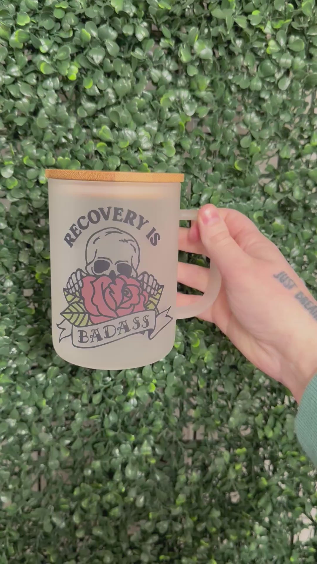 16oz sublimated frosted glass mug with bamboo lid and straw.