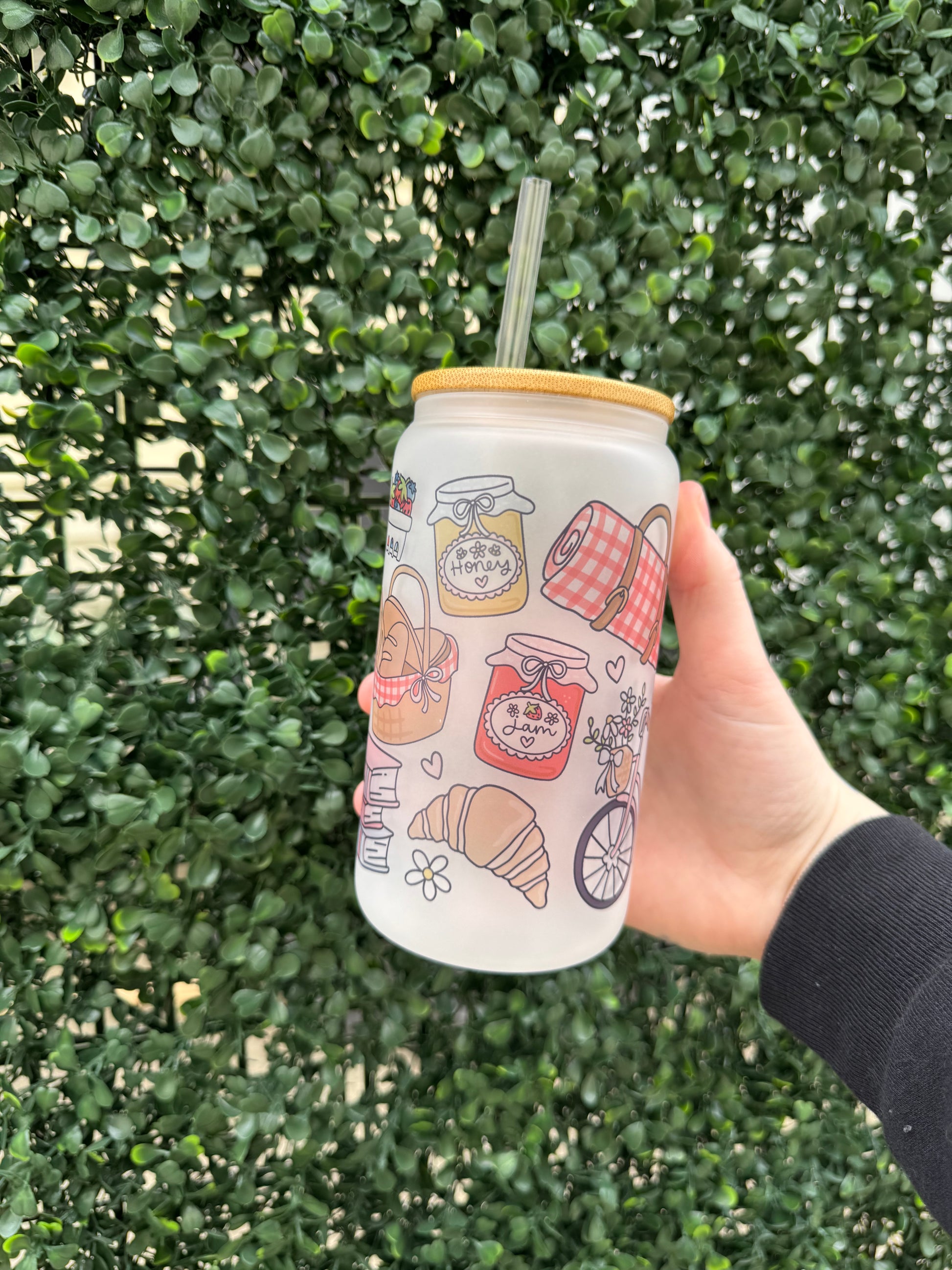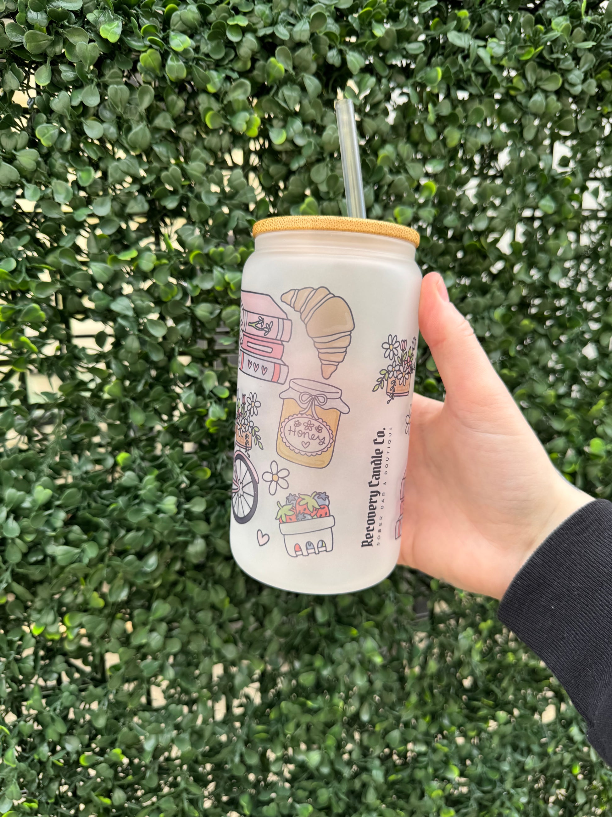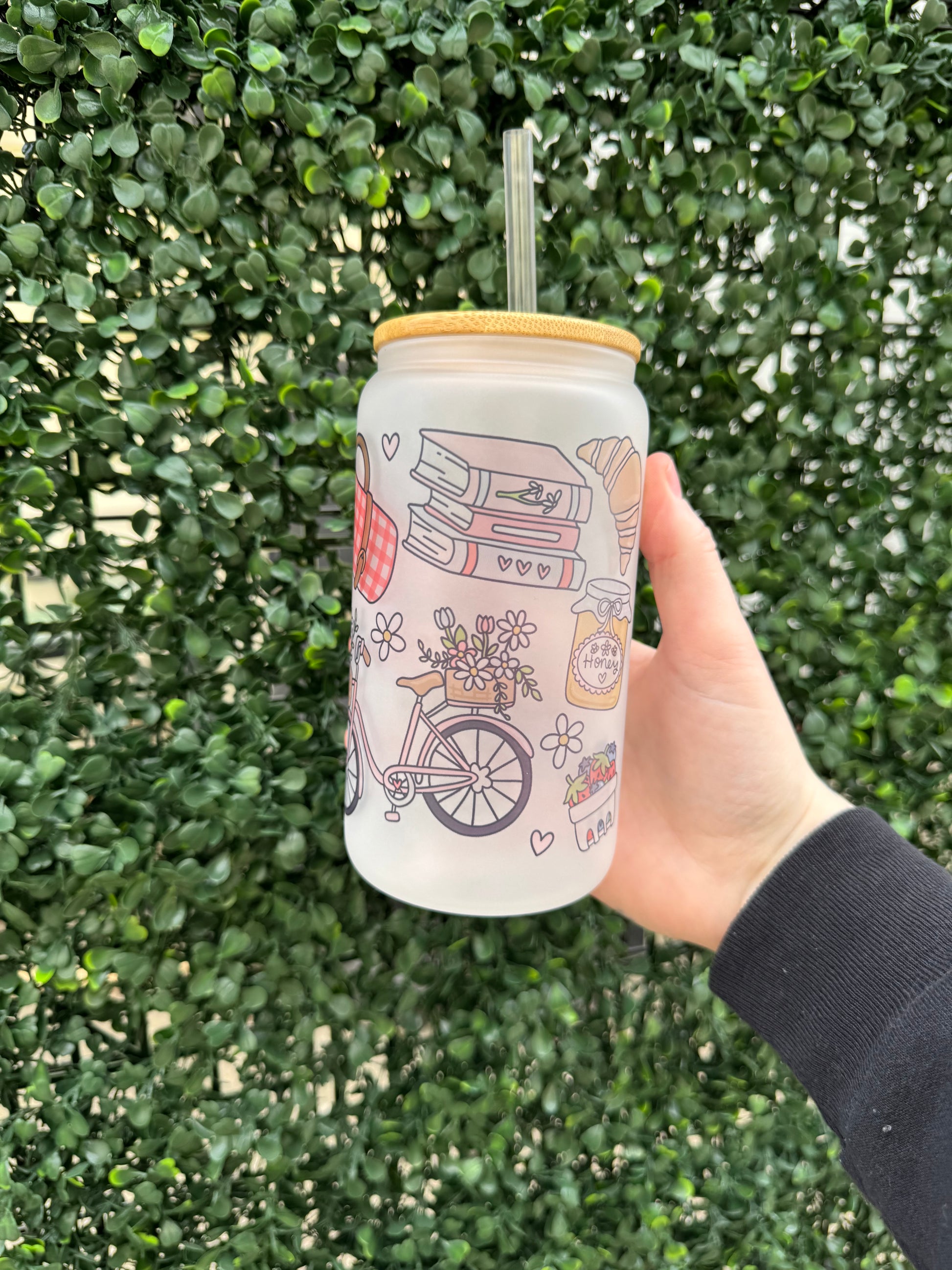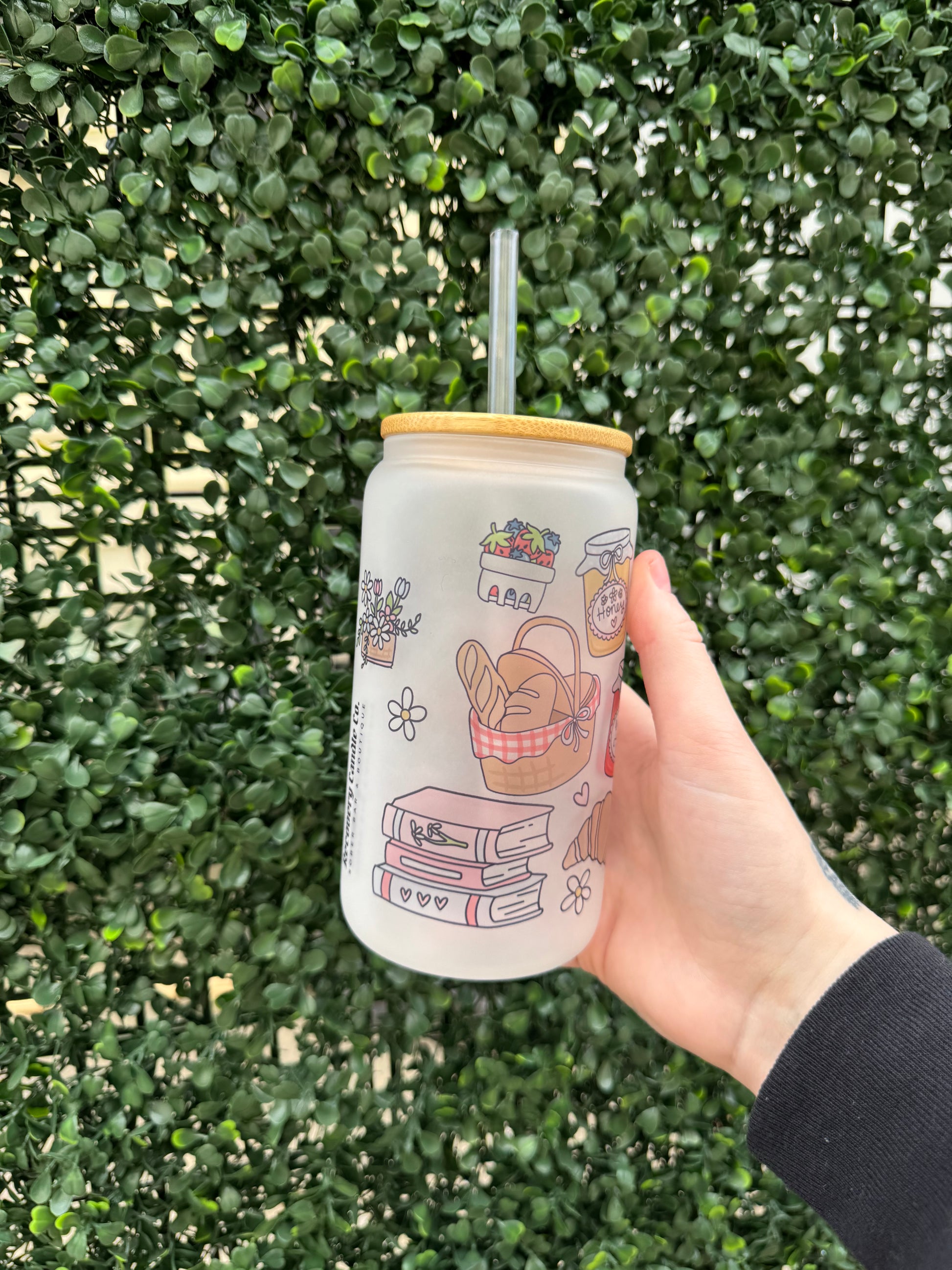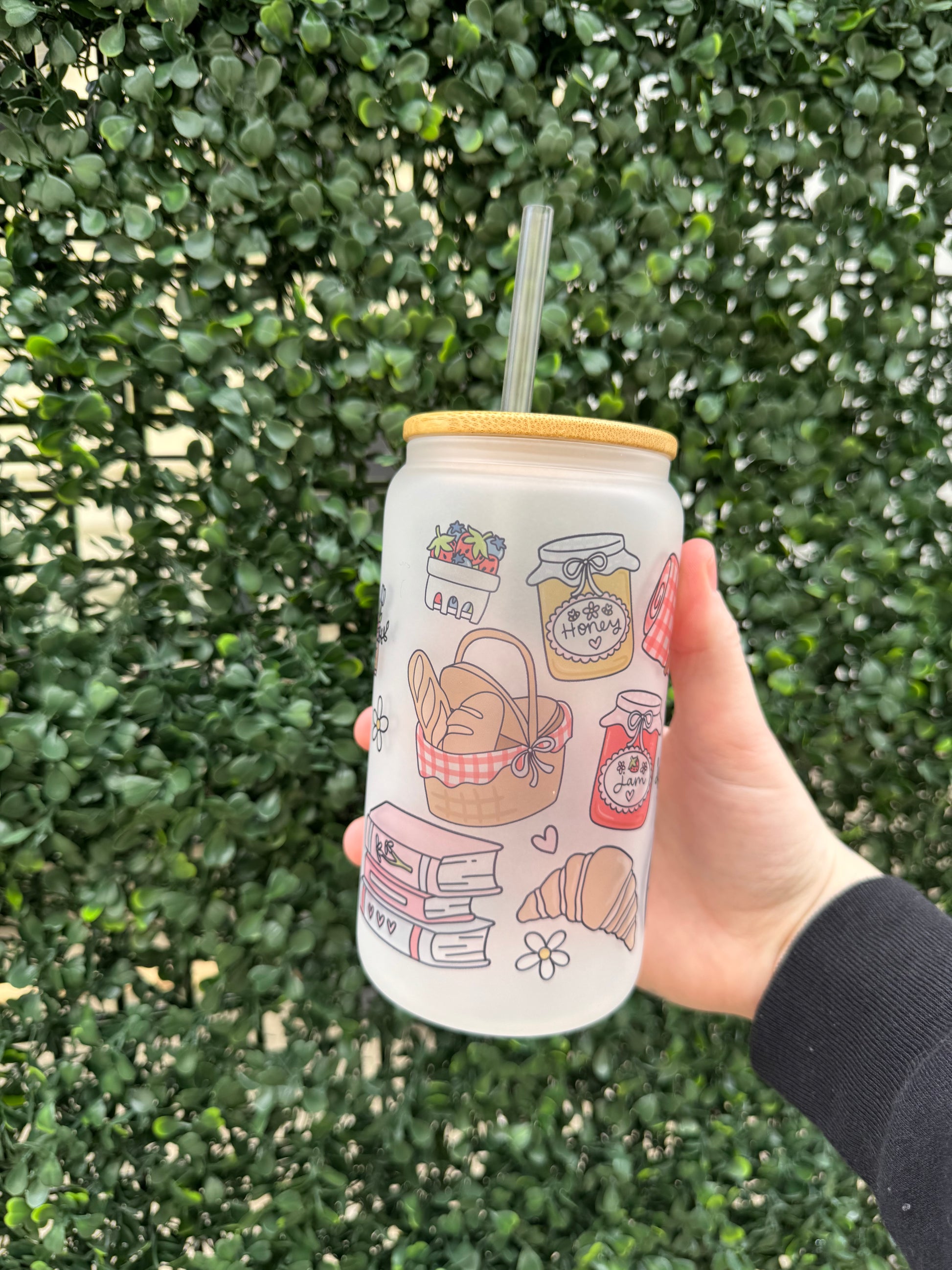 16oz sublimated frosted glass cup with bamboo lid and straw.