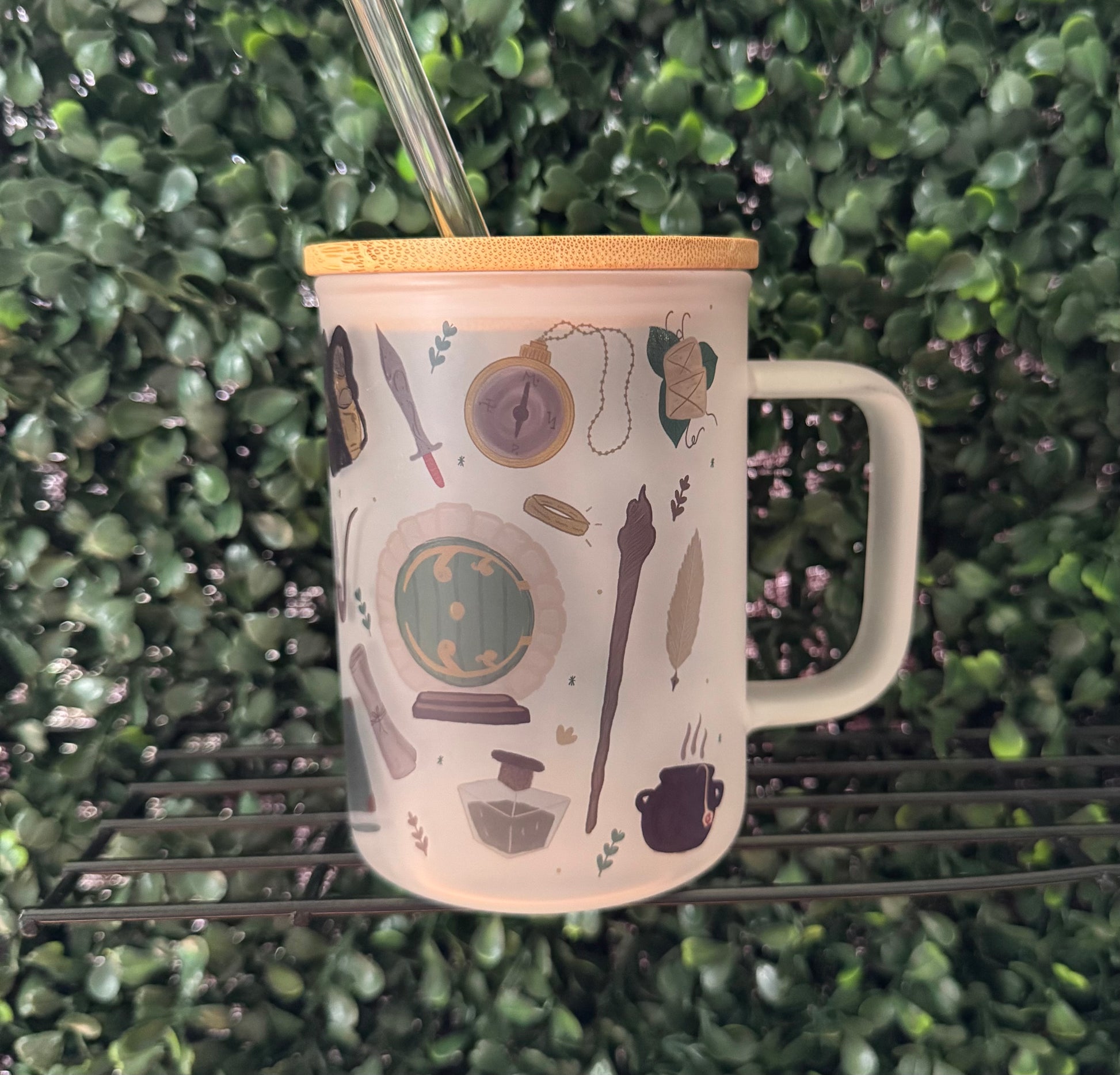 16oz sublimated frosted glass cup with bamboo lid and straw.