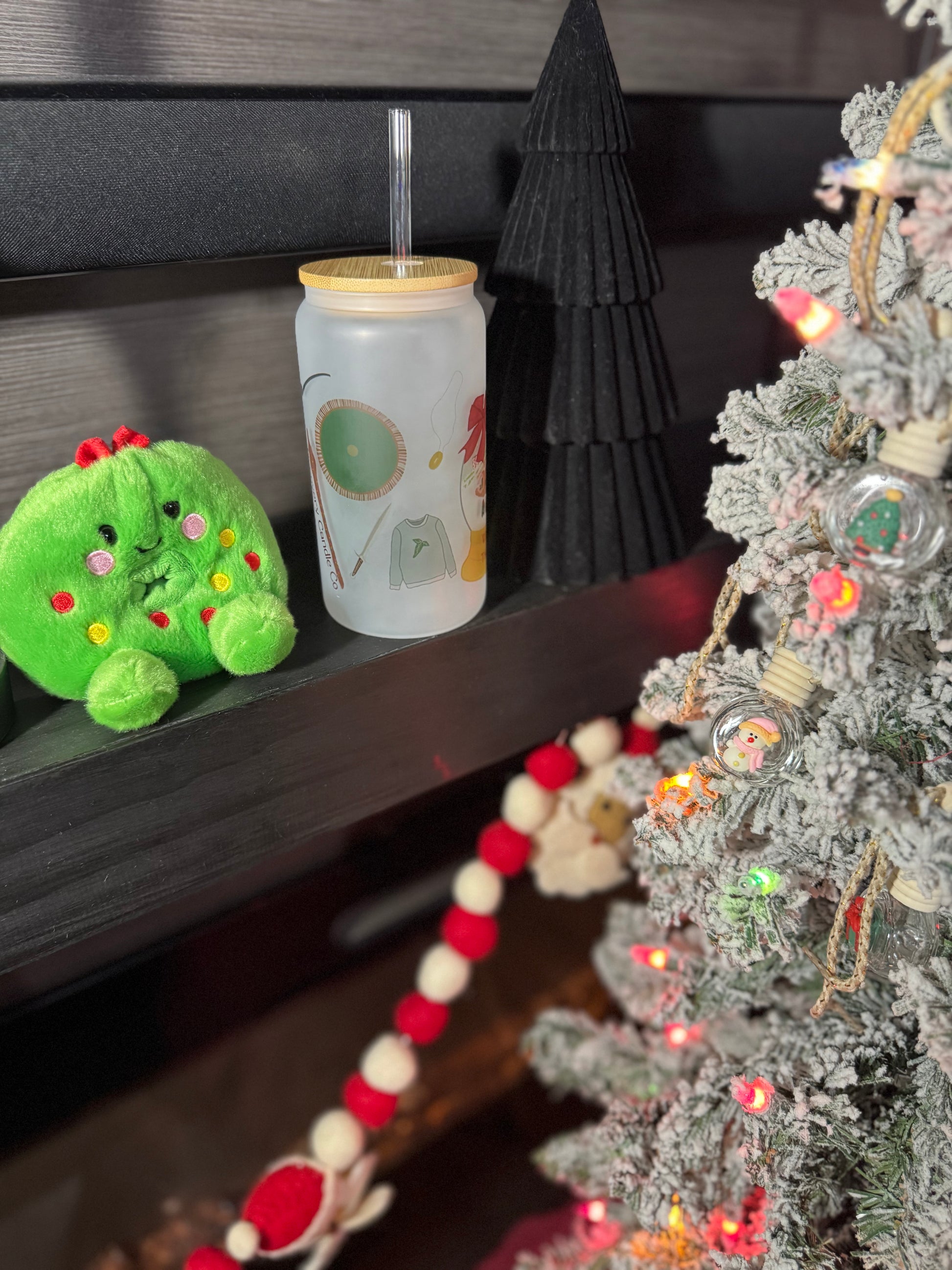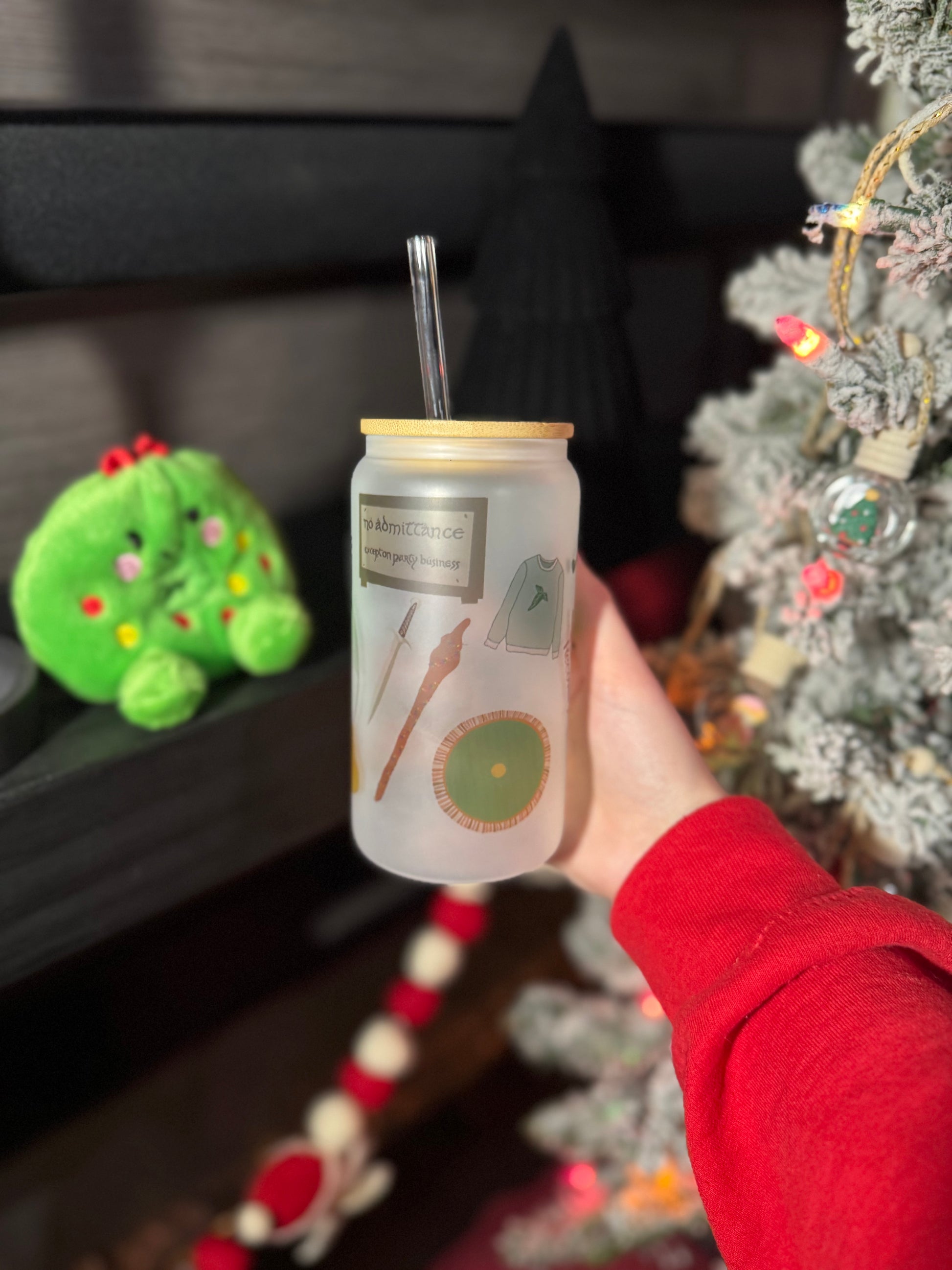 16oz sublimated frosted glass cup with bamboo lid and straw.