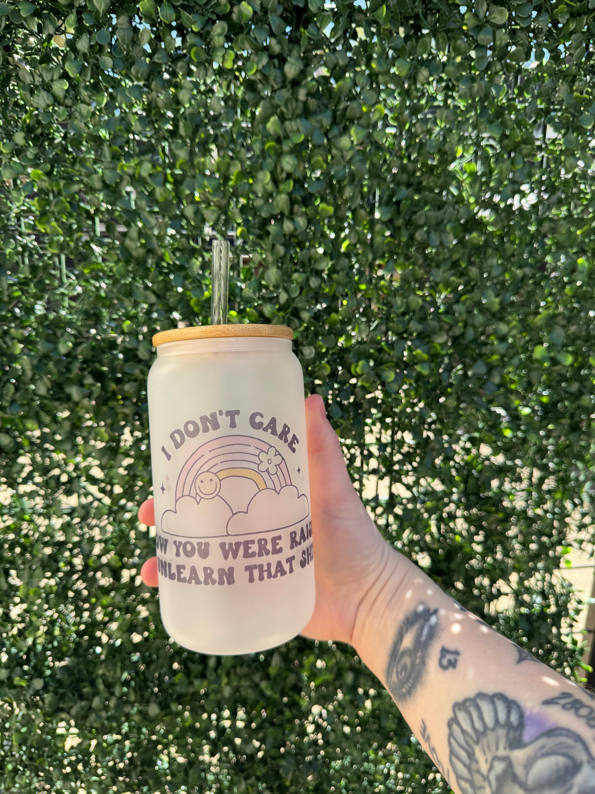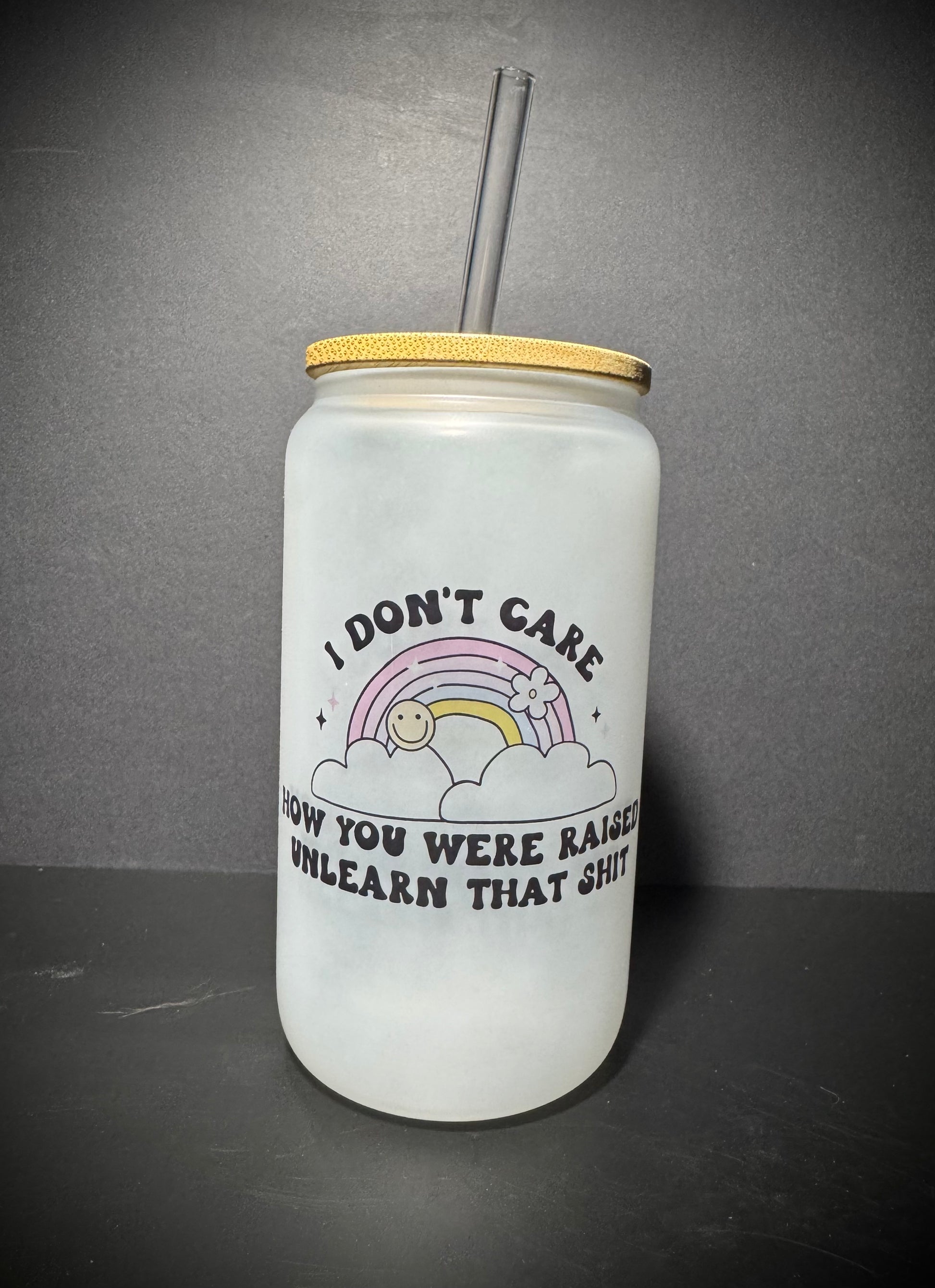 16oz sublimated frosted glass cup with bamboo lid and straw.